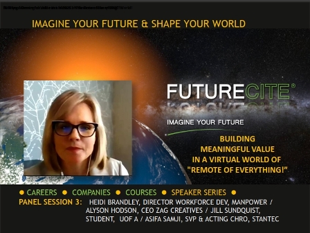 Moderating this panel is Asifa Samji SVP and Chief HR Officer of Stantec.  Joining Asifa as panelists are panelists Heidi Brandley, Director of Workforce Development, Manpower, Alyson Hodson, CEO of Zag Creative, and Jill Sundquist, Student, Uof A (Commerce).